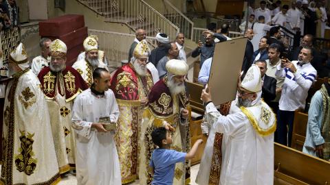Coptic Orthodox Christians gather for an Easter service at the Monastery of Saint Simon the Tanner, located in the Mokattam Mountain area of Cairo, on April 19, 2025. (Ahmed Sayed via Getty Images)