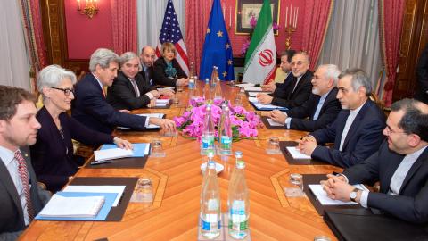 Secretary of State John Kerry greets Iranian Foreign Minister Mohammad Javad Zarif in Vienna on July 14, 2014. (US State Department via Flickr)